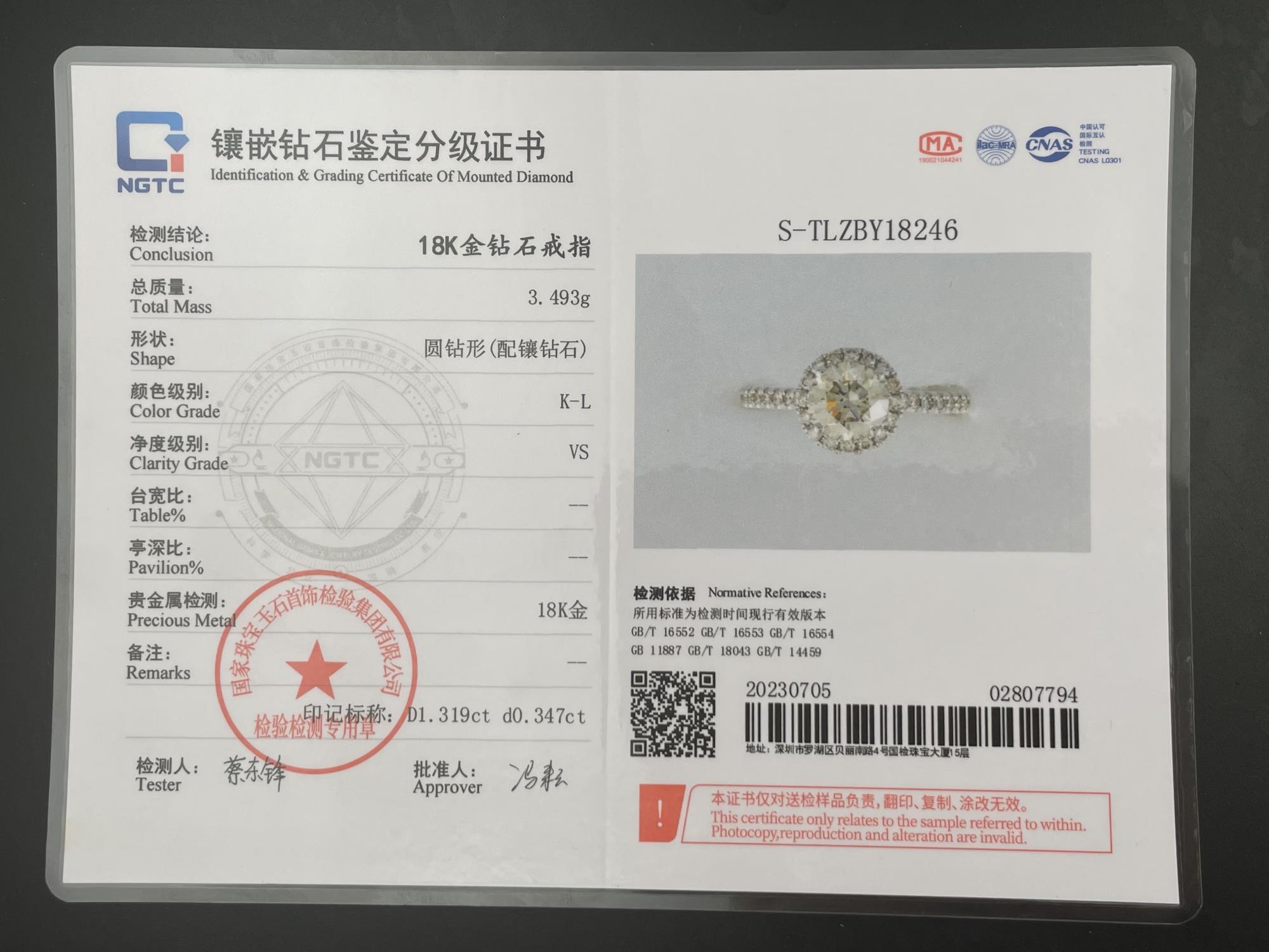 主钻1.319克拉KL色VS净度圆形钻 特价4.97W国检NGTC588246