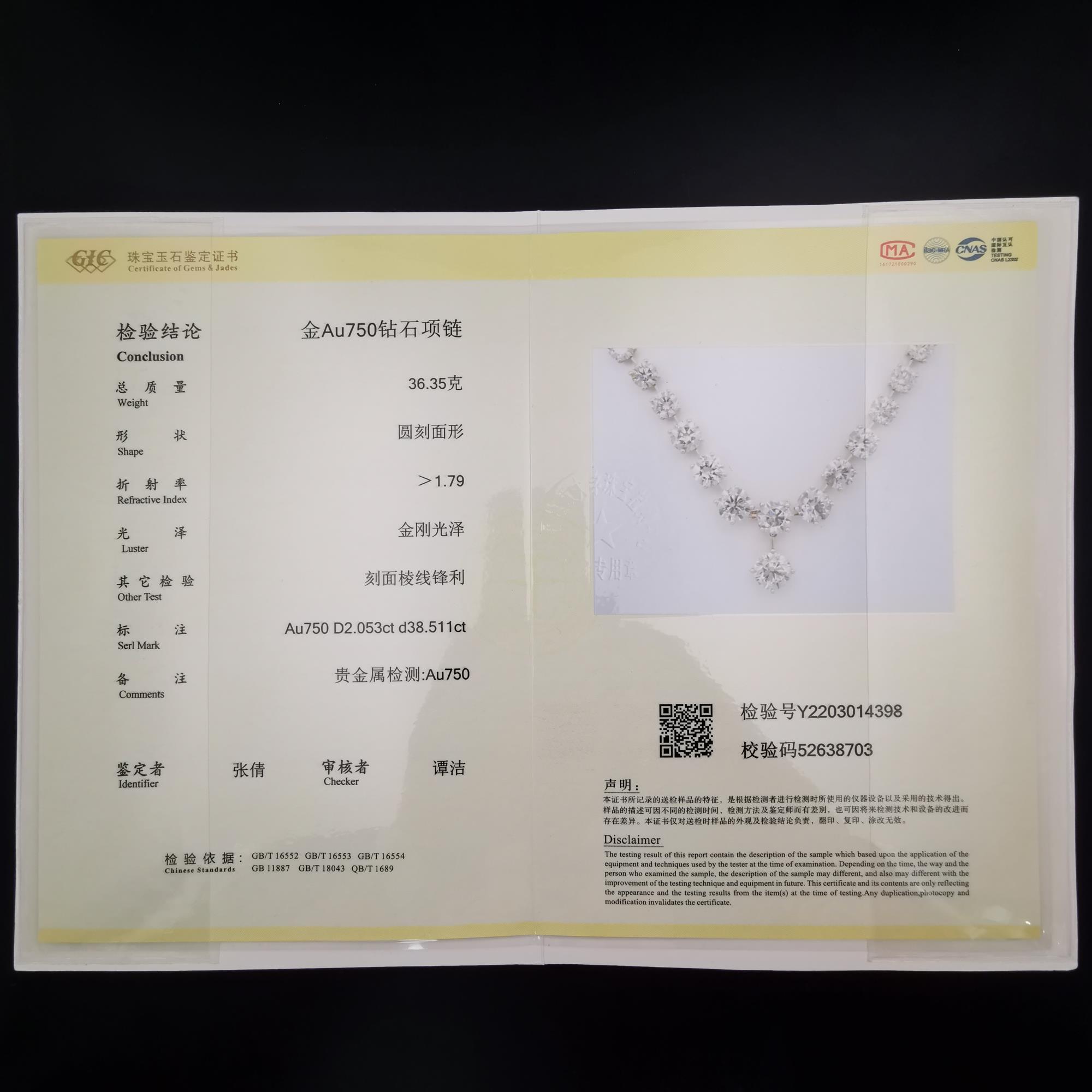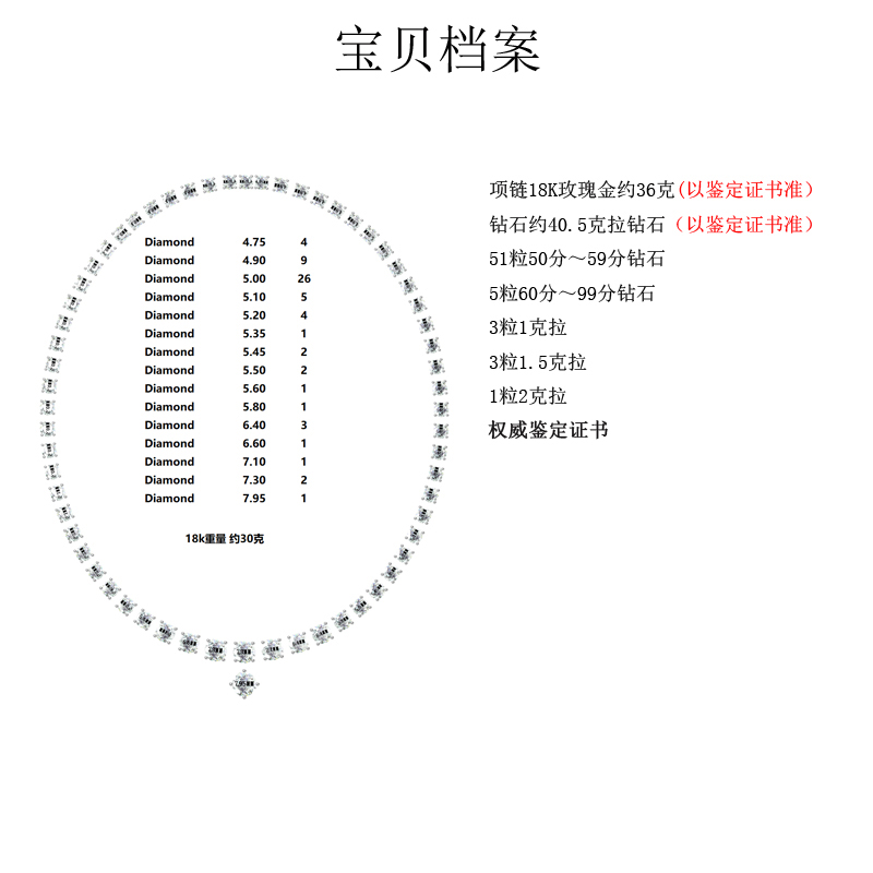 未来女神号项链18K玫瑰金36克 钻石40.5克拉 特价66W 51粒50分~59分钻石 5粒60分~99分钻石 3粒1克拉 3粒1.5克拉 1粒2克拉 现货国家权威证书014398