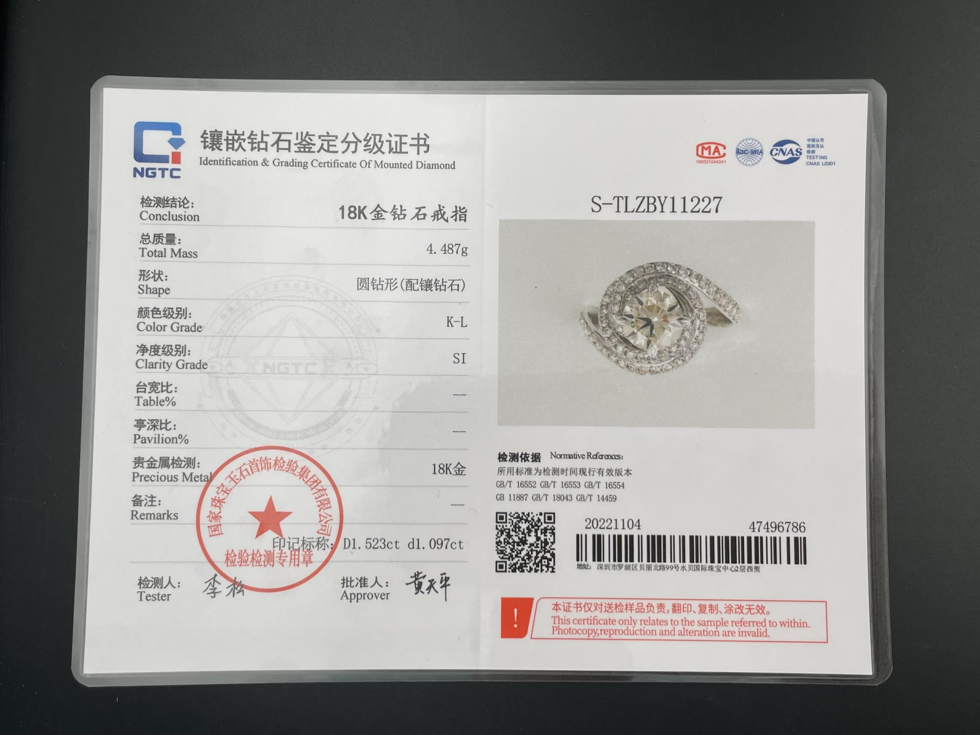 主钻1.523克拉KL色SI净度圆形钻 特价6.84W国检NGTC701227