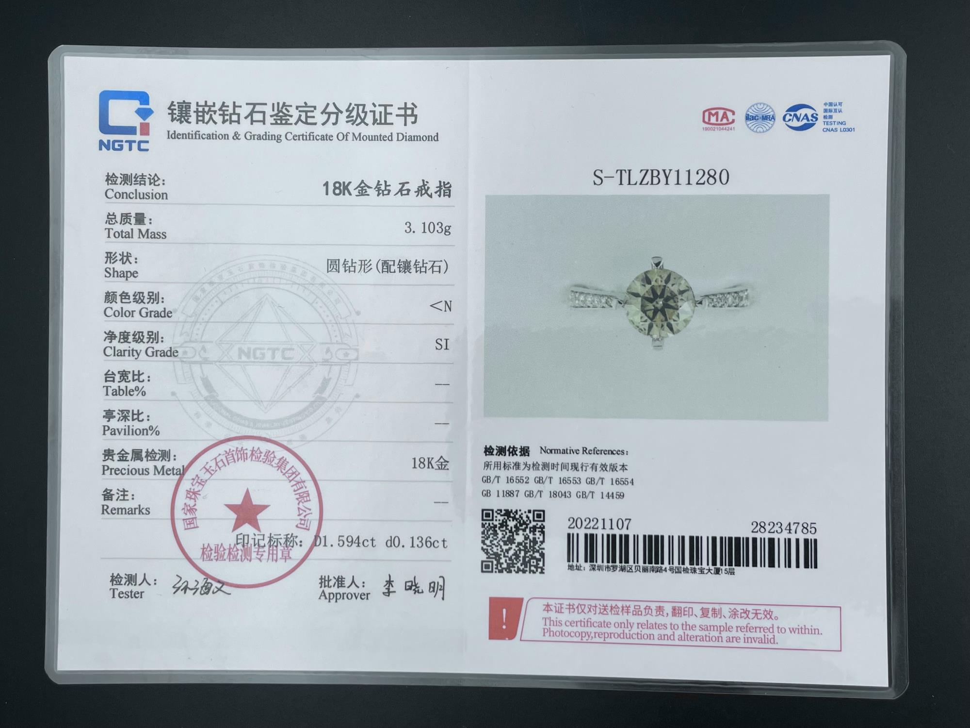 主钻1.594克拉小N色SI净度圆形钻 特价3.5W国检NGTC591280