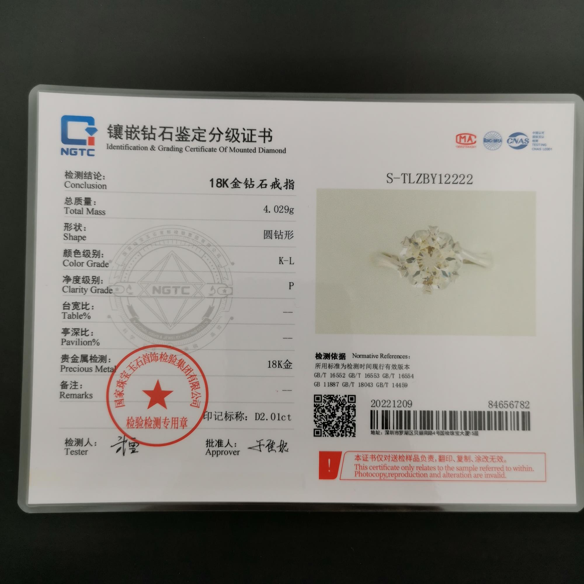 主钻2.01克拉KL色P净度圆形钻 特价10.64W国检NGTC072222