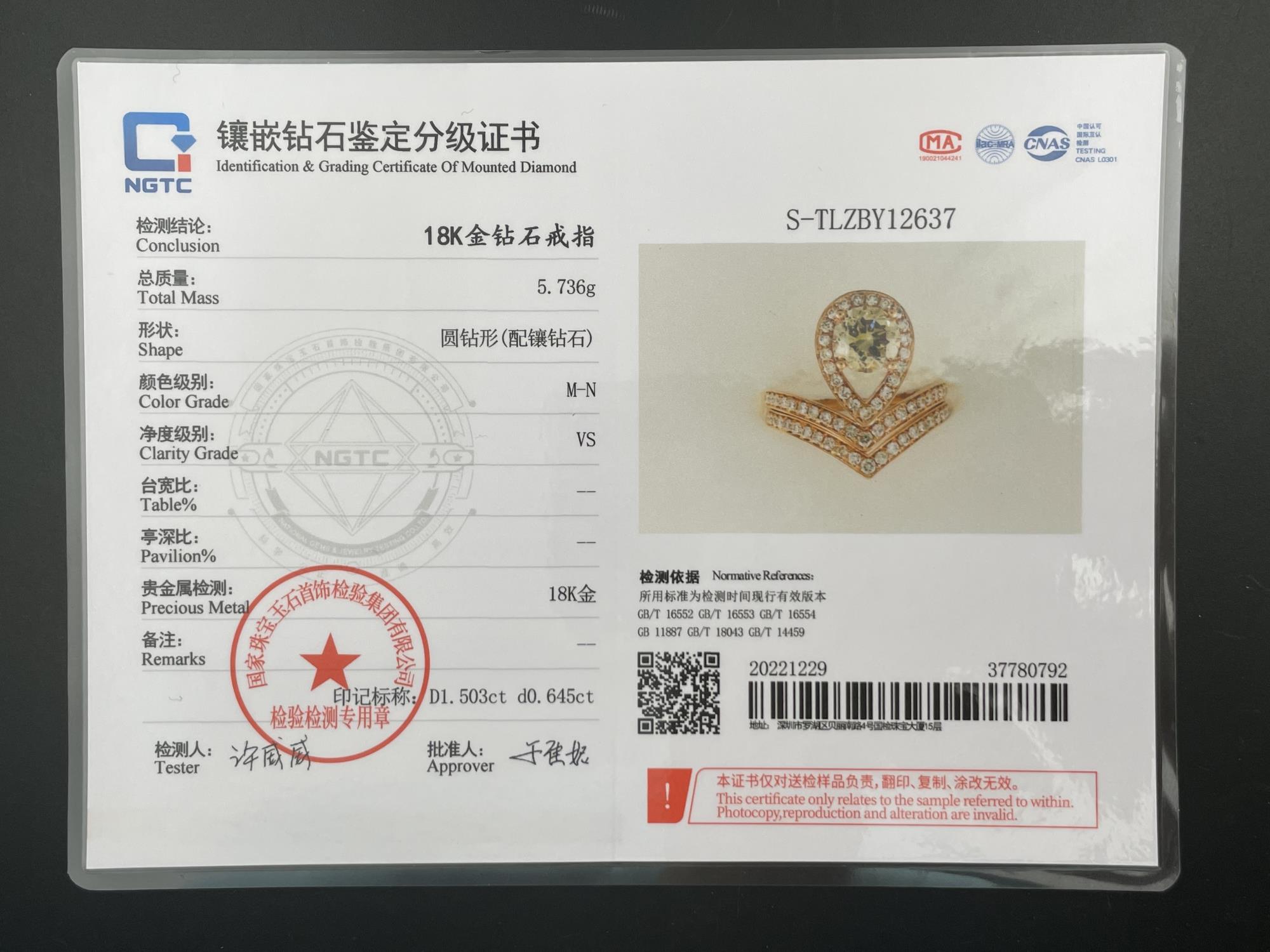 主钻1.503克拉MN色VS净度圆形钻 特价4.34W国检NGTC752637