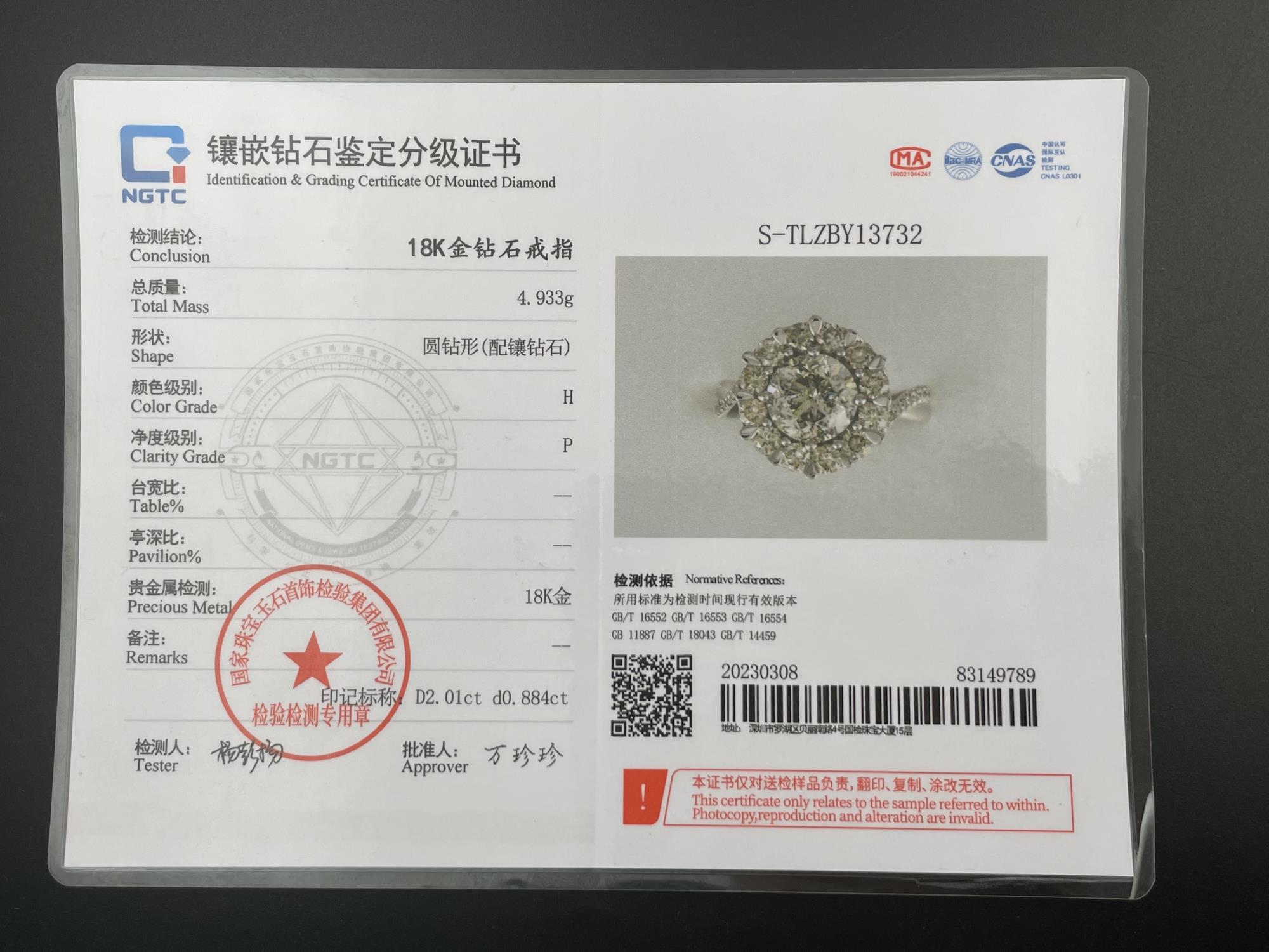 主钻2.01克拉H色P净度圆形钻 特价8W国检NGTC873732