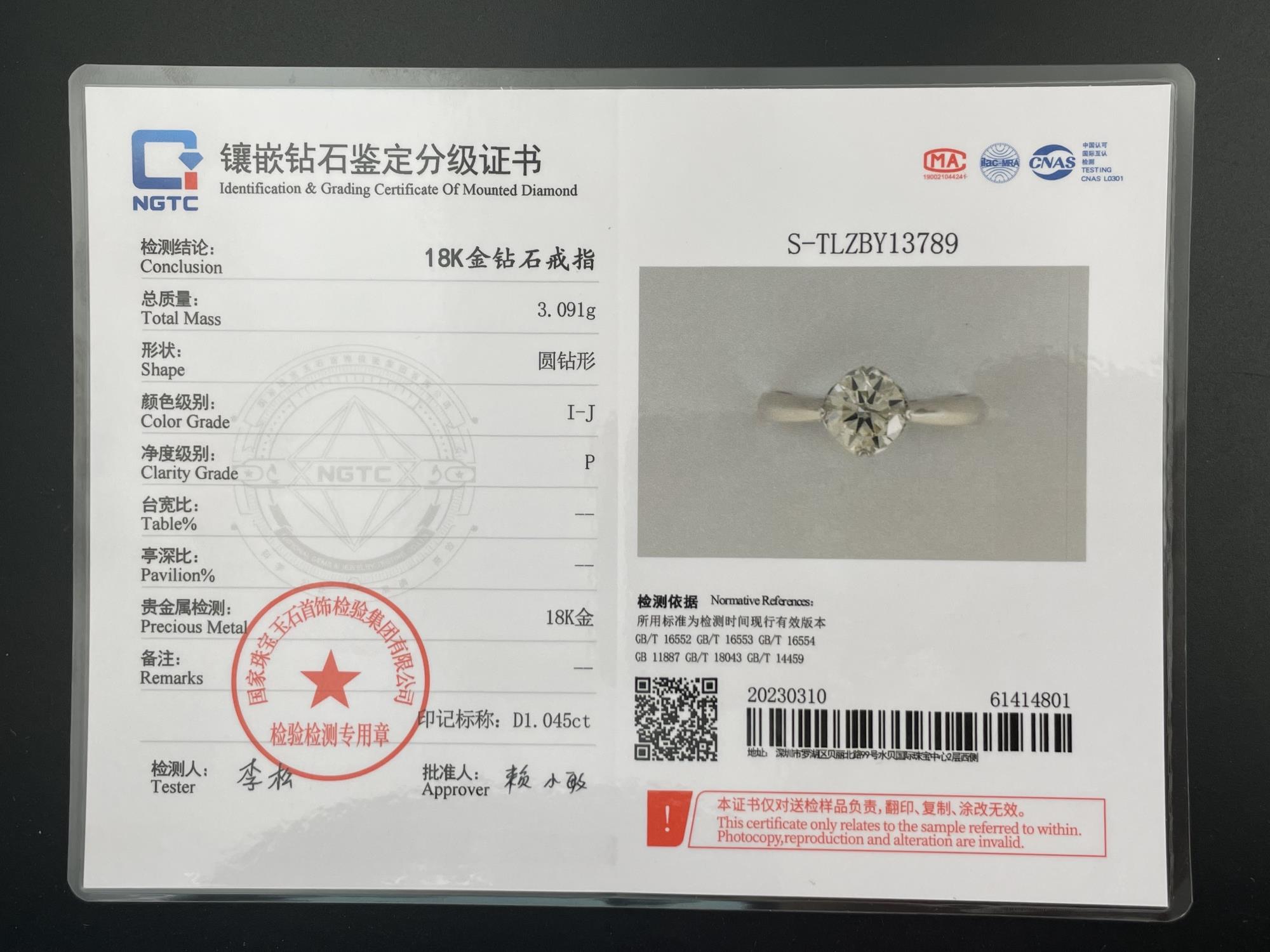 主钻1.045克拉IJ色P净度圆形钻 特价3.3W国检NGTC023789