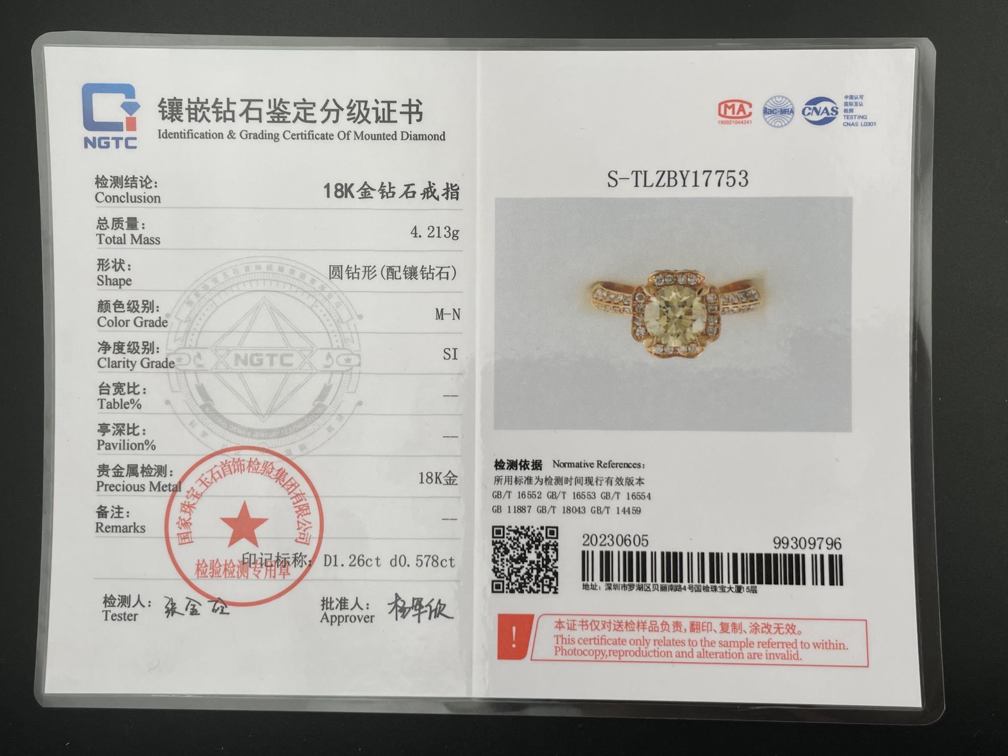 主钻1.26克拉MN色SI净度圆形钻 特价2.12W国检NGTC777753