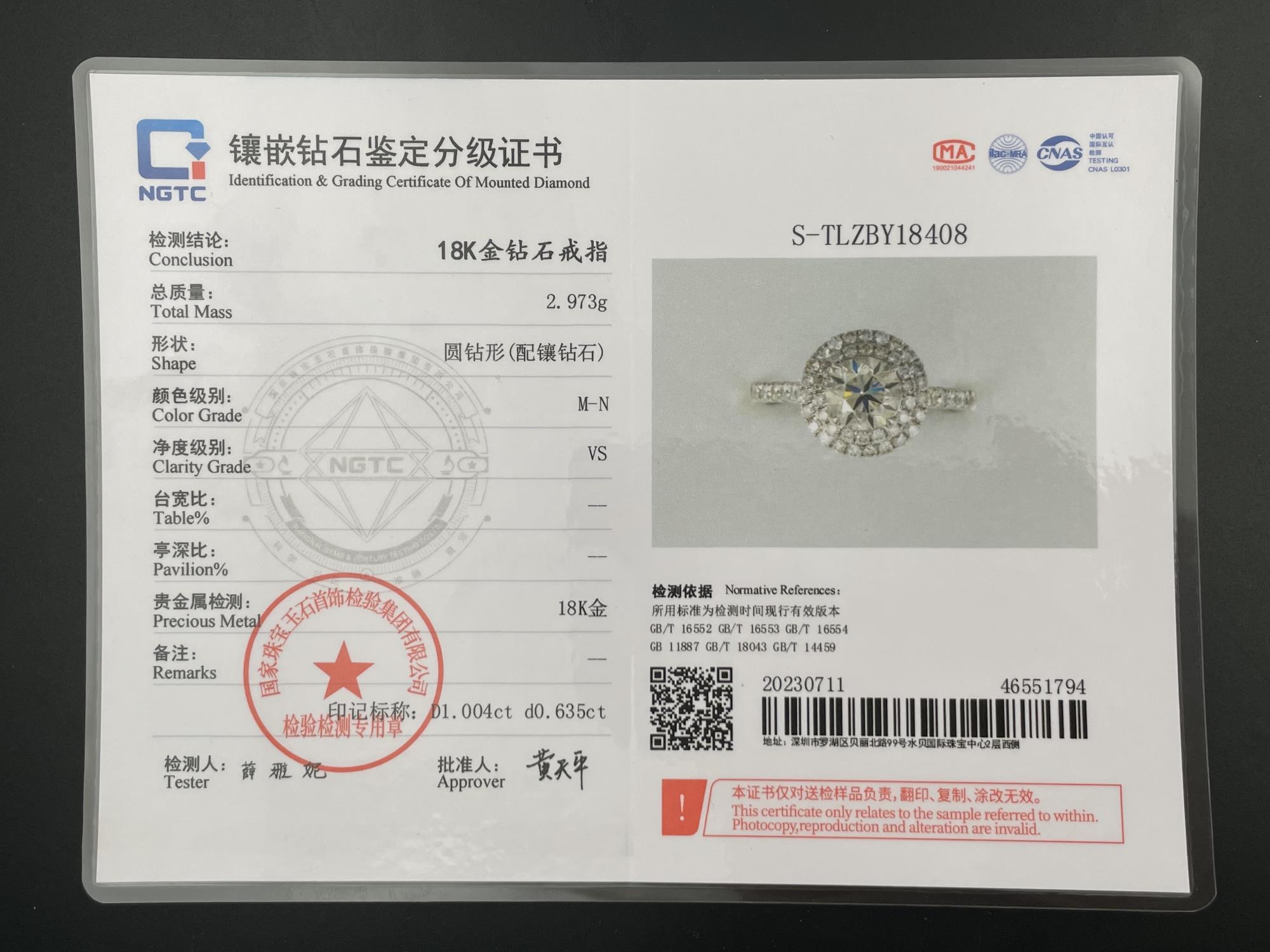 主钻1.004克拉MN色VS净度圆形钻 特价3.14W国检NGTC608408