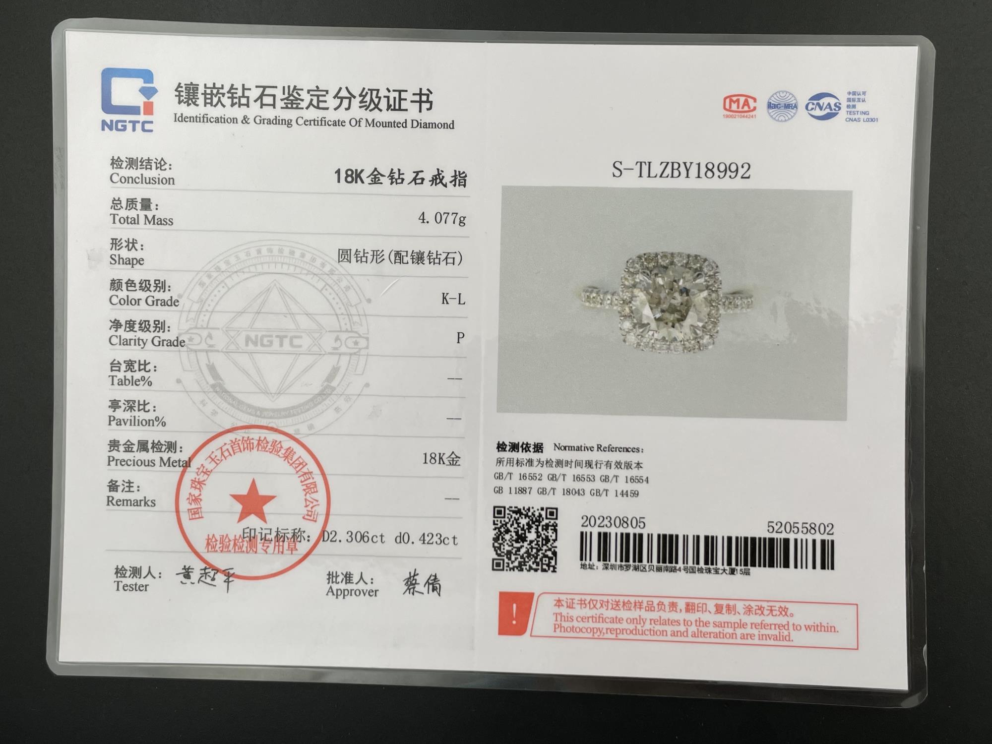 主钻2.306克拉KL色P净度圆形钻 特价7.8W国检NGTC718992