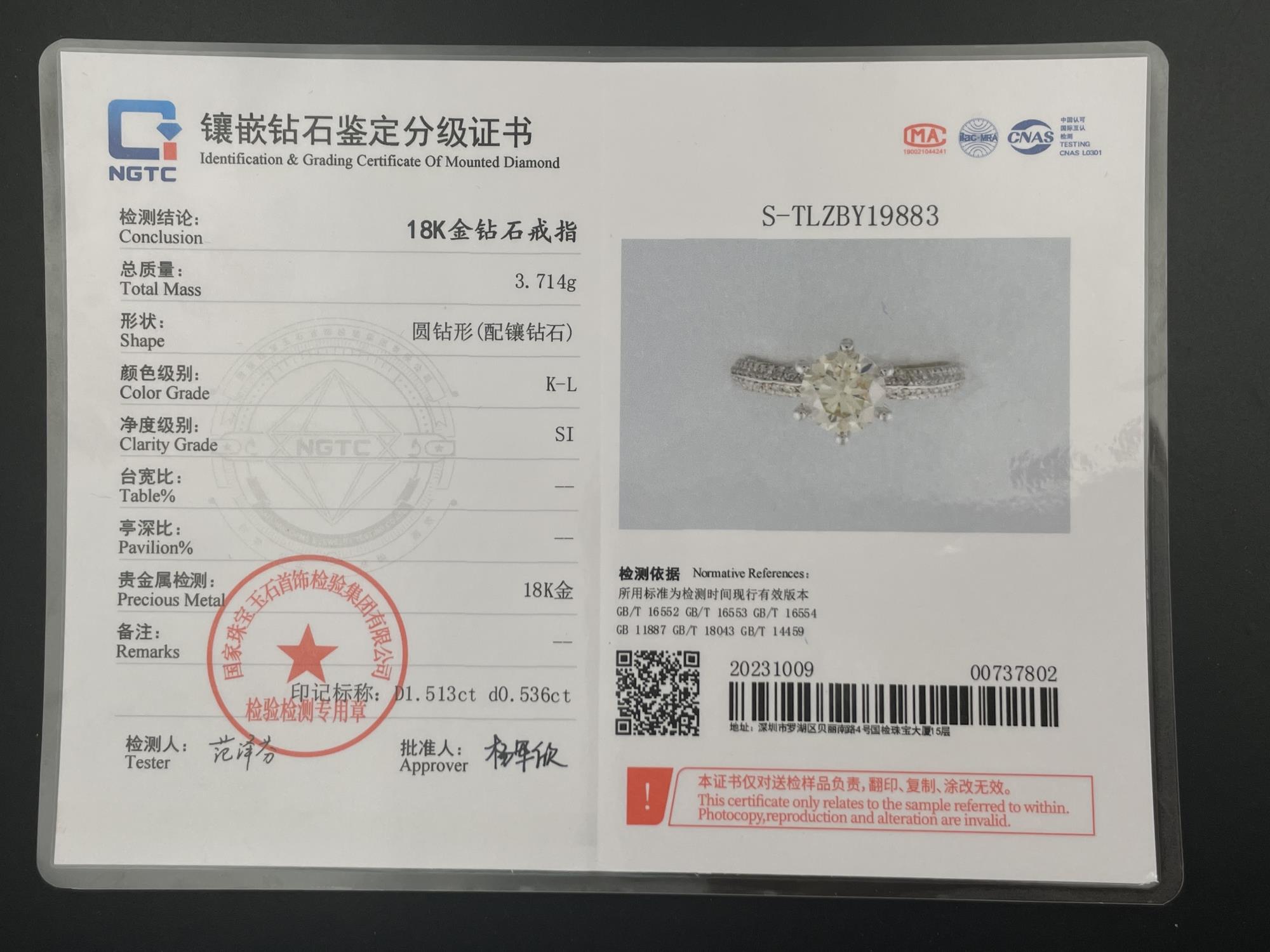 主钻1.513克拉KL色SI净度圆形钻 特价6.47W国检NGTC799883