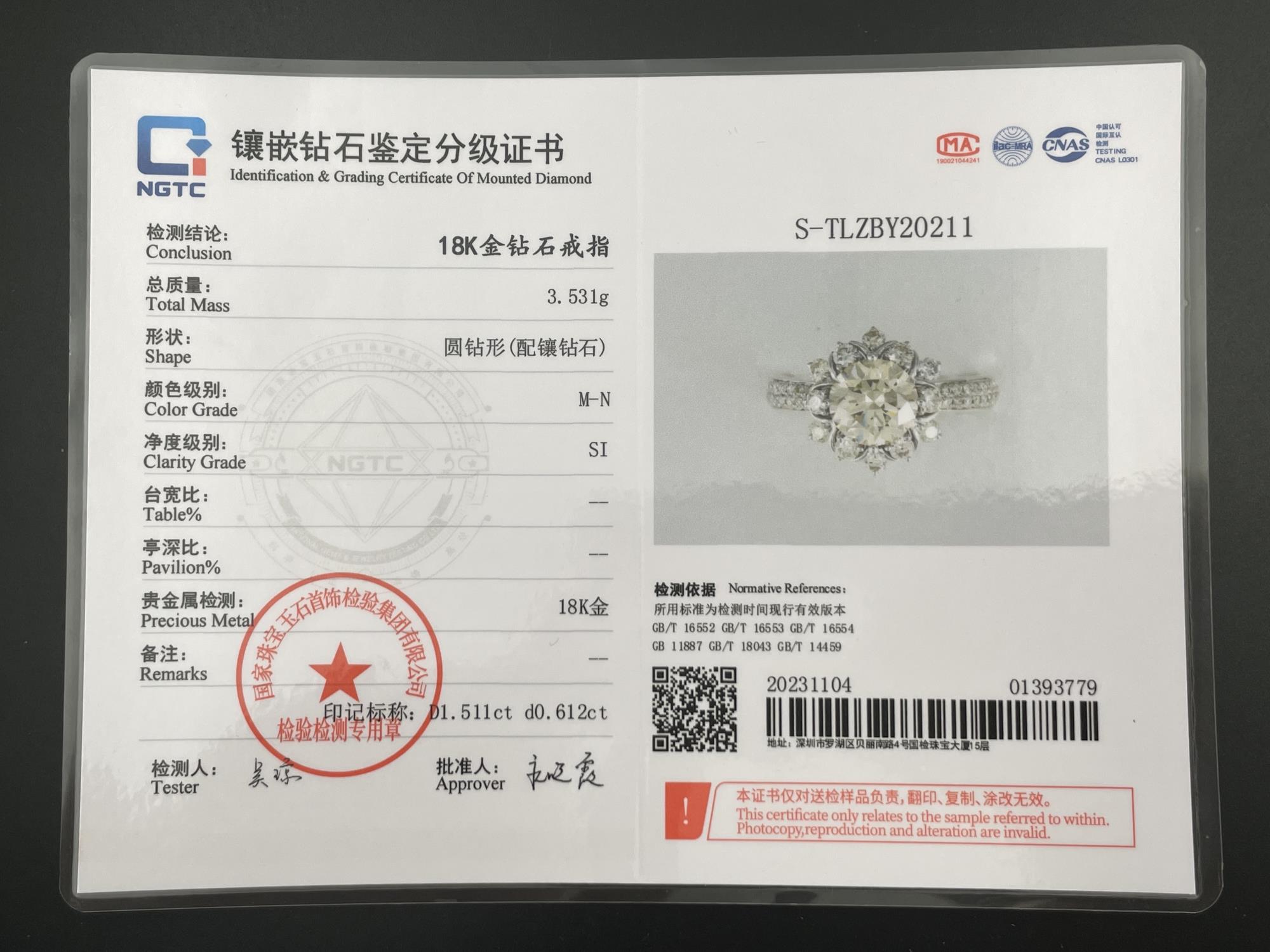 主钻1.511克拉MN色SI净度圆形钻 特价6W国检NGTC850211