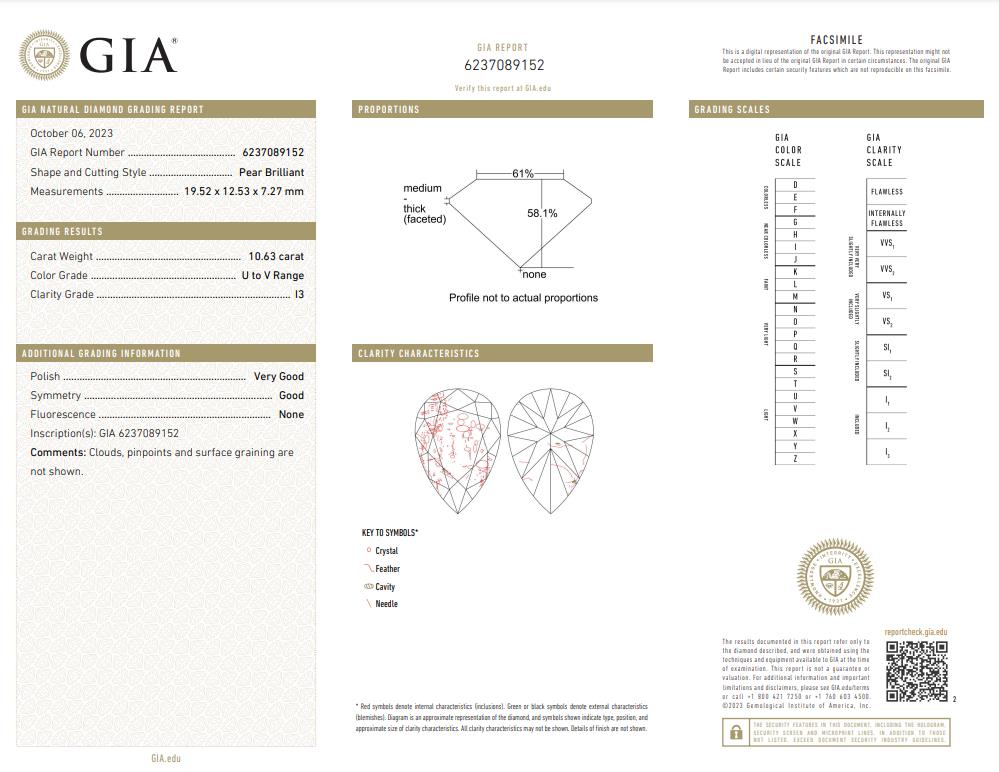 主钻10.63克拉 小N色 P净度 梨形明亮式