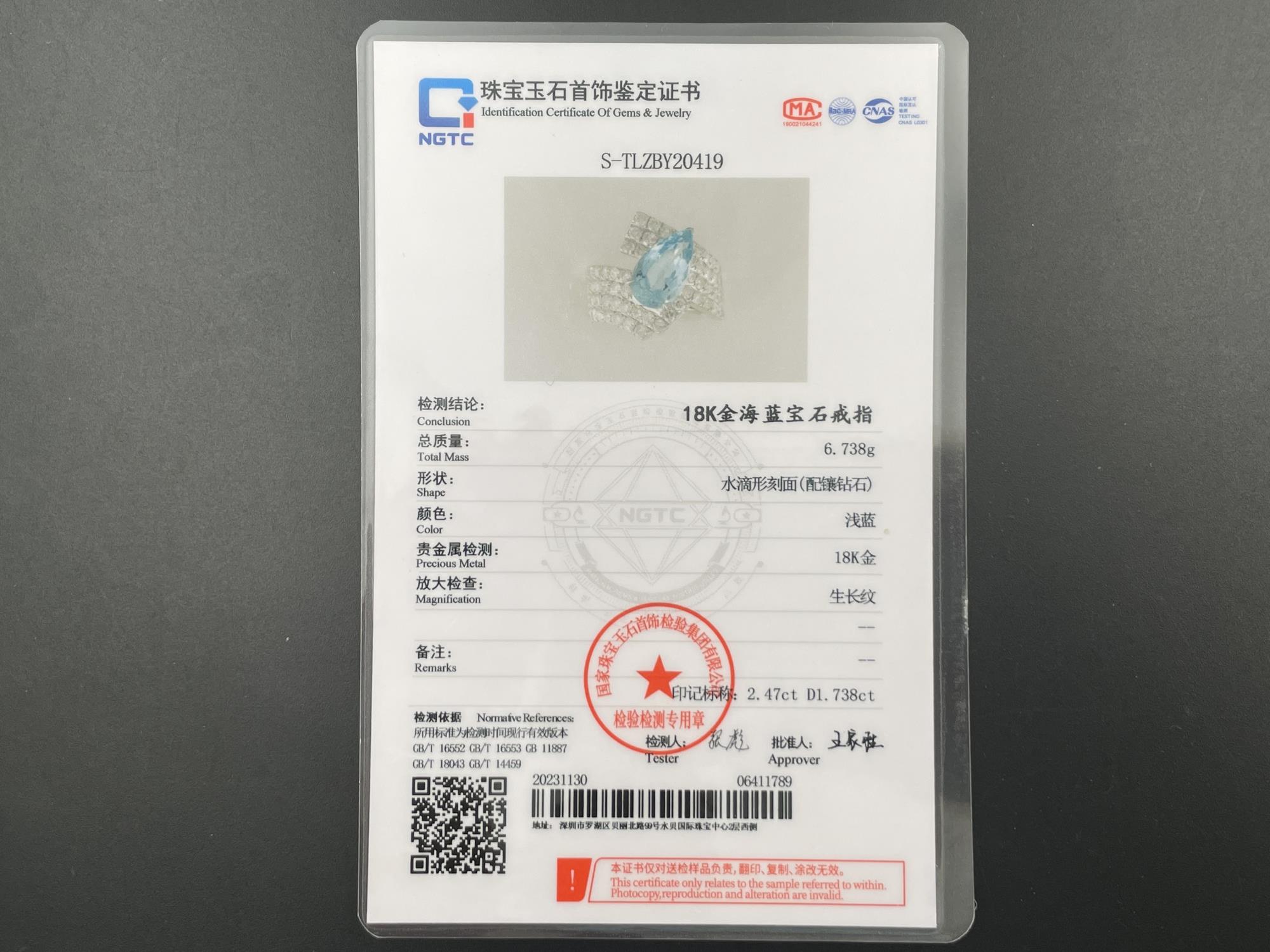主石:水滴形海蓝宝石2.47克拉 副石:钻石1.738克拉 特价3.3W国检NGTC551219