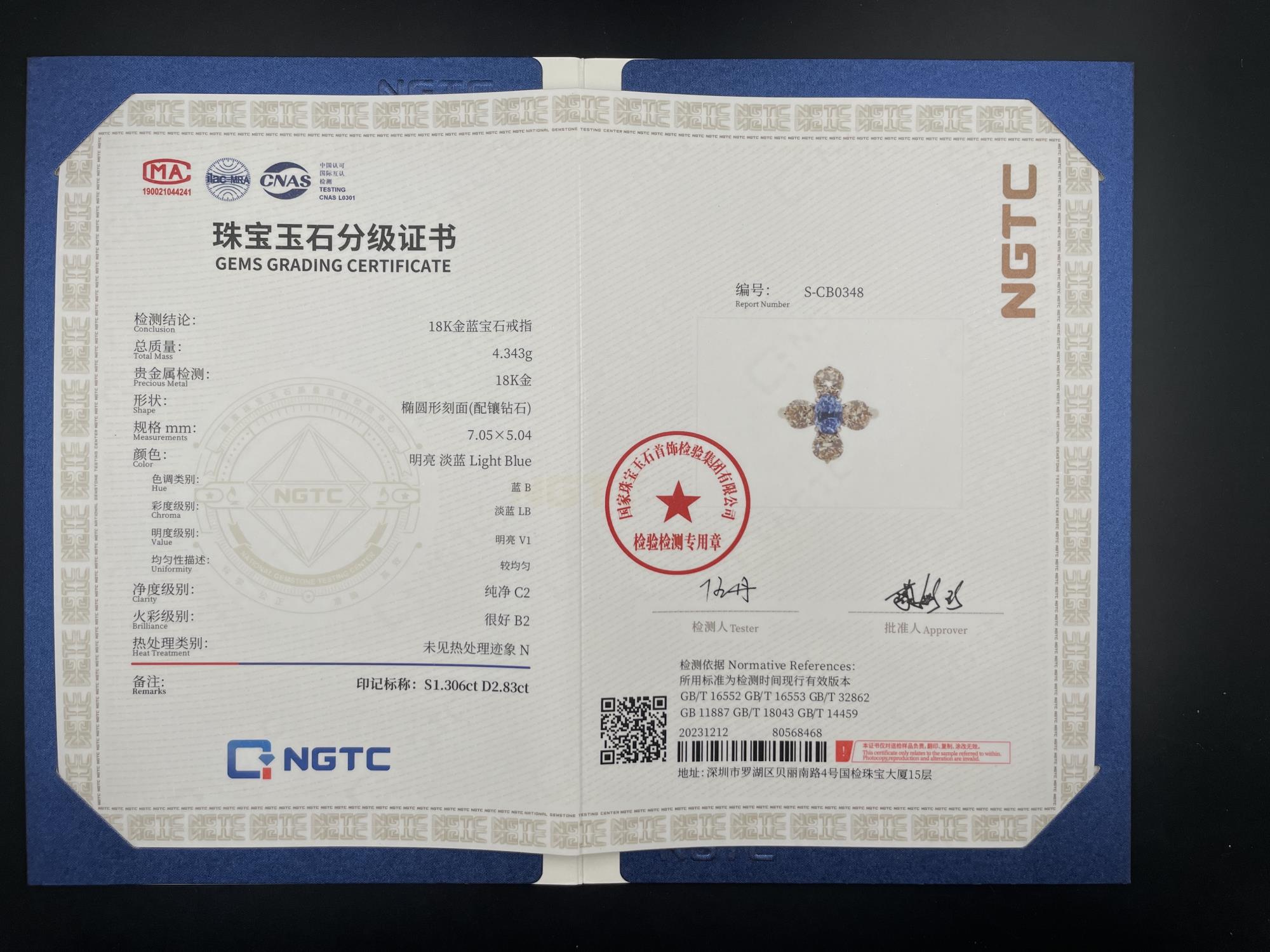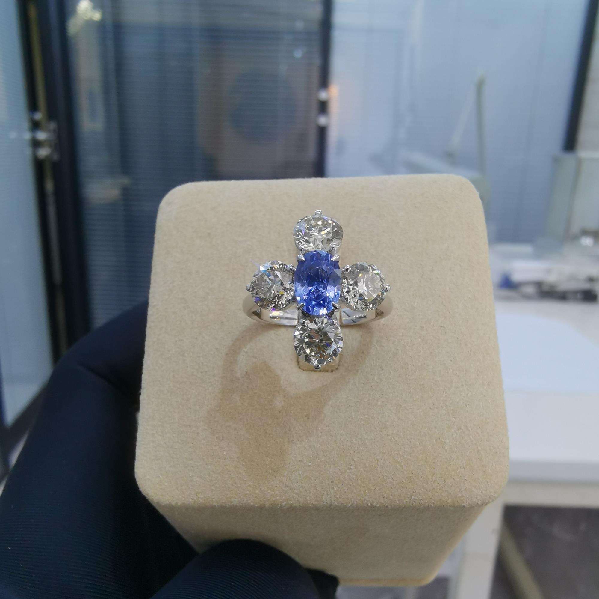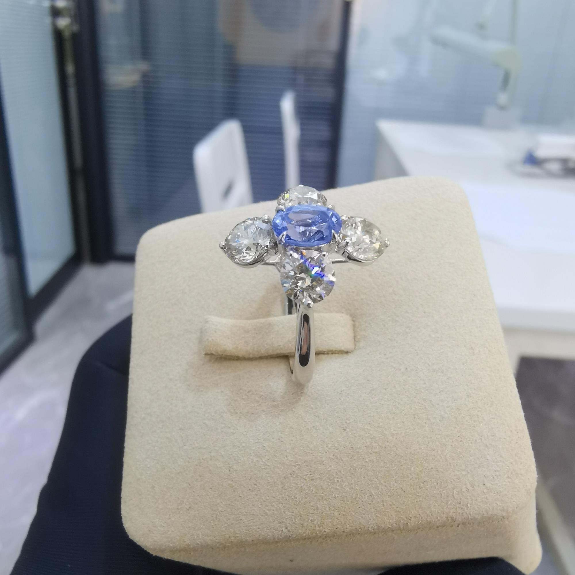 主石:椭圆形无烧蓝宝石1.306克拉 副石:钻石2.83克拉
